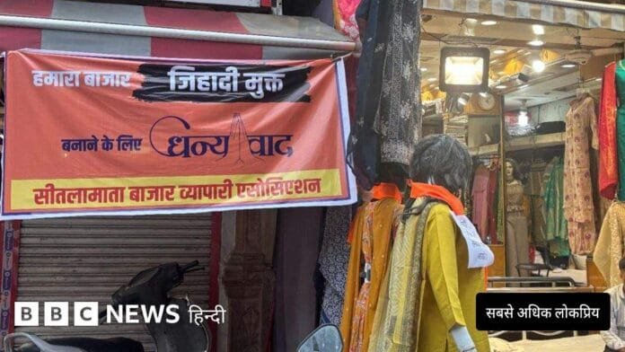 इमेज स्रोत, Samir Khanइमेज कैप्शन, ऐसे कई पोस्टर अब कपड़ा बाज़ार में देखने को मिल रहे हैं. ….मेंमध्यप्रदेश की आर्थिक राजधानी इंदौर के कपड़ा बाज़ार में मुस्लिम सेल्समैन और व्यापारियों को काम करने से मना कर दिया गया है.यह कोई प्रशासनिक या सरकारी आदेश नहीं है बल्कि इंदौर-4 विधानसभा सीट से बीजेपी विधायक मालिनी गौड़ के बेटे एकलव्य सिंह गौड़ का ‘फरमान’ है.इस मामले पर बीबीसी ने एकलव्य गौड़ से संपर्क करने की कोशिश की लेकिन उन्होंने बात करने से इनकार कर दिया.शीतलामाता कपड़ा बाज़ार के अध्यक्ष हेमा पंजवानी ने बताया कि 25 अगस्त को बंद कमरे की एक बैठक में एकलव्य सिंह गौड़ ने व्यापारियों के प्रतिनिधियों से बात की थी. इसी बैठक में शीतलामाता कपड़ा बाज़ार के व्यापारियों के प्रतिनिधियों के लिए यह फ़रमान जारी किया.इसके बाद एकलव्य सिंह गौड़ ने स्थानीय मीडिया को कई बार दिए अपने बयान में कहा, “मेरे पास कई बार लव जिहाद की शिकायतें आ चुकी हैं. यह षडयंत्र अब कोई कल्पना या मनगढ़ंत बात नहीं है. हमारे कपड़ा बाज़ार में ज़्यादातर महिलाएं आती हैं और मुस्लिम सेल्समैन उन्हें लव जिहाद में फंसा लेते हैं.”हालांकि एकलव्य सिंह गौड़ भले ही निर्वाचित प्रतिनिधि नहीं हैं, लेकिन बाज़ार में उनकी बातों का खूब वजन है.शीतलामाता कपड़ा बाज़ार के अध्यक्ष हेमा पंजवानी ने बीबीसी से कहा, “हमारे एकलव्य भैया का आदेश था कि बाज़ार से मुस्लिम सेल्समैन और व्यापारियों को बाहर निकला जाए. उनके पास कई बार लोग लव जिहाद के मुद्दे को लेकर गए थे.”बीजेपी के अल्पसंख्यक मोर्चा के प्रदेश अध्यक्ष एजाज़ अंसारी ने कहा कि वो फिलहाल “टूर पर हैं” और लौटने के बाद इस मामले को “डिटेल में समझेंगे और फिर उचित कदम उठाएंगे”.इमेज स्रोत, Samir Khanइमेज कैप्शन, इंदौर के इस बाज़ार में एकलव्य सिंह गौड़ की बात का असर दिखाई देता है.इंदौर पुलिस के अतिरिक्त पुलिस उपायुक्त राजेश दंडोतिया ने बीबीसी से कहा कि अब तक उनके पास ऐसी कोई शिकायत नहीं आई है. वहीं, विधायक मालिनी गौड़, मेयर पुष्यमित्र भार्गव, इंदौर बीजेपी अध्यक्ष सुमित शर्मा और वरिष्ठ नेता कैलाश विजयवर्गीय ने इस पर टिप्पणी करने से इनकार कर दिया.इस बीच “जिहादी मानसिकता से छुटकारा दिलाने के लिए धन्यवाद” के पोस्टर इंदौर के बाज़ार में कुछ और हक़ीकत बयां कर रहे हैं.लगभग 200 मुस्लिम कर्मचारियों की रोज़ी रोटी का संकटइमेज स्रोत, Samir Khanइमेज कैप्शन, 25 सितंबर तक कई सेल्समैन निकाले जा चुके थे और कई व्यापारियों को दुकान छोड़नी पड़ी है.बीबीसी की टीम जब इस मामले के तह तक जाने के लिए 25 सितंबर को इंदौर पहुंची तो कई मुस्लिम सेल्समैन नौकरी से निकाले जा चुके थे और कई मुस्लिम व्यापारी अपनी दुकानें खाली कर चुके थे या करने वाले थे.मुसलमानों को बा