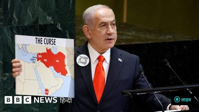 इमेज स्रोत, Getty Imagesइमेज कैप्शन, प्रधानमंत्री बिन्यामिन नेतन्याहू के बयान पर हमास ने प्रतिक्रिया दी हैहमास का कहना है कि संयुक्त राष्ट्र महासभा में इसराइल के प्रधानमंत्री बिन्यामिन नेतन्याहू का भाषण ‘गुमराह करने वाला’ था.इसराइली पीएम नेतन्याहू ने शुक्रवार को न्यूयॉर्क में संयुक्त राष्ट्र महासभा को संबोधित किया. जैसे ही नेतन्याहू मंच पर पहुंचे, कई देशों के प्रतिनिधि विरोध में हॉल से बाहर निकलने लगे.नेतन्याहू के भाषण के बाद हमास ने टेलीग्राम पर एक बयान जारी किया है.बीबीसी उर्दू के मुताबिक़, हमास ने इस बयान में कहा कि नेतन्याहू ने एक “गुमराह करने वाला” भाषण दिया, जिसमें “झूठ की एक लंबी लिस्ट” शामिल थी.बयान में कहा गया, “झूठ सच्चाई को नहीं बदल सकता और दुनिया अब इस बात को ज़्यादा जानती है कि इसराइल ग़ज़ा में क्या कर रहा है.”हमास ने कहा, “हम दुनिया भर से अपील करते हैं कि वह ग़ज़ा में हत्या और तबाही को रोके.”बयान में कहा गया, “इसराइल को ग़ज़ा से हटने के लिए मजबूर करें.” साथ ही हमास ने बाक़ी देशों से फ़लस्तीन को एक देश के रूप में मान्यता देने की अपील की है.इसराइली पीएम ने क्या कहा?नेतन्याहू ने अपने भाषण में फ़लस्तीन को राष्ट्र का दर्जा देने को ‘सरासर पागलपन’ बताया और कहा कि कई देशों द्वारा मान्यता देना ‘शर्मनाक’ है.नेतन्याहू का कहना था कि इसराइल के लाउडस्पीकर ग़ज़ा में उनके भाषण का प्रसारण कर रहे हैं.उन्होंने हमास से कहा, “आप हथियार डाल दें, हमें अंदर जाने दें और बंधकों को छुड़ाने दें, वरना हम आपको ढूंढ निकालेंगे और मार डालेंगे.”हमास द्वारा बंधक बनाए गए लोगों को संबोधित करते हुए, उन्होंने कहा, “हम आपको नहीं भूले हैं – एक पल के लिए भी नहीं. इसराइल के लोग आपके साथ हैं