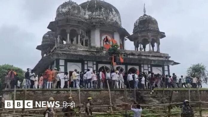 इमेज कैप्शन, फ़तेहपुर के अबूनगर इलाक़े में नवाब अब्दुस समद के मक़बरे में हिंदू संगठन के लोग घुस गए. उनका दावा है कि ये मंदिर था. ….मेंAuthor, सैयद मोज़िज इमाम पदनाम, बीबीसी संवाददाता, लखनऊ से13 अगस्त 2025फ़तेहपुर के अबूनगर इलाक़े में नवाब अब्दुस समद के मक़बरे को लेकर विवाद पैदा हो गया है.कई हिंदू संगठन इसके अंदर मंदिर होने का दावा कर रहे हैं.कुछ लोग 11 अगस्त को मक़बरे में घुस गए और तोड़-फोड़ की. इन संगठनों का दावा है कि इस मक़बरे के भीतर हिंदू देवी-देवताओं के निशान हैं.पुलिस की मौजूदगी के बावजूद हिंदू संगठन के लोग बैरिकेड तोड़कर परिसर में घुस गए. हालांकि, बाद में फ़तेहपुर के ज़िलाधिकारी रविंद्र सिंह ने दावा किया कि अब हालात ‘सामान्य’ हैं.पुलिस ने दस ज्ञात और 150 अज्ञात लोगों के ख़िलाफ़ एफ़आईआर दर्ज की है. एसपी अनूप कुमार सिंह ने कहा, ”उपद्रवियों की पहचान की जा रही है.”कानपुर-प्रयागराज जीटी रोड पर फ़तेहपुर ज़िला है. ये गंगा-यमुना के बीच के दोआब क्षेत्र में स्थित है.फ़तेहपुर के ज़िला मुख्यालय के कोतवाली इलाके में अबू नगर है. ये मक़बरा इसी इलाके में स्थित है. इसके गुंबदों की हालत बेहद खराब है.ज़िला गज़ेटियर बताता है कि नवाब अब्दुस समद, औरंगज़ेब के दौर में पैलानी (बुंदेलखंड) के फ़ौजदार थे. उन्हें बड़ी जागीरें मिली हुई थीं.उन्होंने मुत्तौर में किला और टैंक बनवाए, लेकिन रहने का ठिकाना यहीं फ़तेहपुर रखा.पांच सौ साल पुराने मक़बरे को लेकर विवाद इमेज कैप्शन, हिंदू संगठन के लोग पुलिस की मौजूदगी में इस मक़बरे में घुस गए. फतेहपुर के गज़ेटियर के मुताबिक, यहां शहर में कोई इमारत नहीं है जिसका कोई ऐतिहासिक महत्व हो सिवाय नवाब अब्दुस समद के मक़बरे के जो उनके जीर्ण-शीर्ण किले के बराबर में है.गज़ेटियर में बताया गया है कि अबू नगर का नाम अब्दुस समद के बड़े बेटे अबू मोहम्मद के नाम पर है.मक़बरे पर एक शिलालेख में अब्दुस समद की मृत्यु की तारीख़ 1699 ईस्वी है. वहीं उनके पुत्र अबू मोहम्मद की मृत्यु की तारीख़ 1704 ईस्वी लिखी है.हालांकि गज़ेटियर में इसके डिज़ाइन को लेकर कहा गया है, ”यह एक भारी, अव्यवस्थित संरचना है जिसके प्रत्येक कोने पर एक गुंबद है, जो केंद्रीय गुंबद की ऊंचाई के बराबर है.”इमेज कैप्शन, गज़ेटियर जिसमें अब्दुस समद का ज़िक्र है.इस परिसर में एक बड़ा चिनाई वाला टैंक और सजावटी मंडप था.मक़बरे के केयरटेकर मोहम्मद नफीस दावा करते हैं, “मक़बरा करीब 500 साल पुराना है. यहां पर अबू मोहम्मद और अबू समद की मज़ारें हैं.”मोहम्मद नफीस ने कहा, ”ये मक़बरा दस साल में बनकर तैयार हुआ था. हमसे पहले अनीस भाई इसकी देखरेख करते थे. उनके देहांत के बाद मैं इसकी देखभाल करता हूँ.”इलाहाबाद विश्वविद्यालय के इतिहास विभाग के प्रोफेसर हेम्ब्रम चतुर्वे