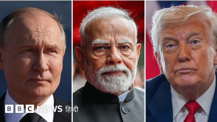 इमेज स्रोत, Getty Imagesइमेज कैप्शन, रूस के राष्ट्रपति व्लादिमीर पुतिन, भारत के प्रधानमंत्री नरेंद्र मोदी, अमेरिका के राष्ट्रपति डोनाल्ड ट्रंप (बाएं से दाएं) ….मेंAuthor, अभिनव गोयलपदनाम, बीबीसी संवाददाता 12 अगस्त 2025रूस और अमेरिका, दोनों ही दशकों से भारत के लिए अहम रणनीतिक साझेदार रहे हैं.मौजूदा वैश्विक हालात ने इस सवाल को और तीखा कर दिया है कि भारत के लिए किसके साथ रहना ज़्यादा फायदेमंद है?अमेरिकी राष्ट्रपति डोनाल्ड ट्रंप ने रूस से तेल खरीदने के चलते भारत पर अतिरिक्त 25 प्रतिशत का टैरिफ़ लगा दिया है.इस तरह यह नया टैरिफ़ पहले से लागू 25 प्रतिशत टैरिफ़ के साथ जुड़कर कुल 50 प्रतिशत हो जाएगा.रूस के साथ भारत के रिश्ते पुराने और भरोसेमंद रहे हैं. रक्षा सौदों से लेकर ऊर्जा आपूर्ति तक रूस, भारत का अहम साझेदार रहा है.स्टॉकहोम इंटरनेशनल पीस रिसर्च इंस्टीट्यूट (सिपरी) के मुताबिक 2019 से 2023 के बीच रूस से होने वाला हथियार आयात 36 प्रतिशत का था.वहींं हाल के सालों में रूस से आने वाले सस्ते कच्चे तेल ने भारतीय अर्थव्यवस्था को बड़ी राहत दी है.दूसरी तरफ, अमेरिका भारत का सबसे बड़ा ट्रेड पार्टनर है. साल 2024-25 में दोनों देशों के बीच 131.84 बिलियन डॉलर का व्यापार हुआ. वहीं, हाई-टेक डिफेंस इक्विपमेंट से लेकर क्लीन एनर्जी तक के क्षेत्र में अमेरिका पर भारत की निर्भरता बढ़ी है.लेकिन सबसे बड़ा सवाल यही है कि अमेरिका और रूस के बीच बढ़ते टकराव में भारत के लिए किसका साथ फ़ायदेमंद रहेगा?आर्थिक नज़रिए से नफ़ा-नुकसानइमेज स्रोत, Getty Imagesइमेज कैप्शन, जानकारों का मानना है कि रूस से तेल खरीदने पर भारत को करीब दस बिलियन डॉलर की सालाना बचत हो रही है. भारत अपनी कुल ज़रूरत का क़रीब 88 प्रतिशत तेल आयात करता है.वाणिज्य मंत्रालय के आंकड़ों के मुताबिक़, वित्त वर्ष 2024-25 में भारत के कुल तेल आयात का लगभग 35 प्रतिशत हिस्सा रूस से आया, जबकि वित्त वर्ष 2018 में यह केवल 1.3 प्रतिशत ही था.यूक्रेन युद्ध के बाद रूस पर पश्चिमी देशों ने प्रतिबंध लगाए. उसके बाद वह सस्ते दामों पर तेल बेच रहा है, जिससे भारत को बड़ा फ़ायदा पहुंच रहा है.सर्च ग्रुप ग्लोबल ट्रेड रिसर्च इनीशिएटिव (जीटीआरआई) के फ़ाउंडर अजय श्रीवास्तव का मानना है कि रूस से सस्ता तेल खरीदकर भारत सालाना दस बिलियन डॉलर की बचत कर रहा है.वे कहते हैं, “वहीं दूसरी तरफ भारत का अमेरिका के साथ करीब 41 बिलियन डॉलर का ट्रेड सरप्लस (निर्यात ज्यादा, आयात कम) है. हम करीब 87 बिलियन डॉलर का सामान अमेरिका को दे रहे हैं.”अजय श्रीवास्तव कहते हैं, “अगर ट्रंप का 50 प्रतिशत टैरिफ़ बना रहता है तो भारत के निर्यात में 50 बिलियन डॉलर तक की गिरावट आ सकती है. रूस से तेल ना खरीदने की स्थिति में यह टैरिफ़ 25 प्रतिशत पर रहेगा और भारत का निर्यात 30 बिलियन तक गिरेगा.”