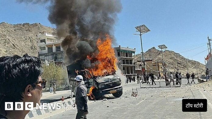 इमेज स्रोत, Disney via Getty Imagesइमेज कैप्शन, लेह में भारतीय जनता पार्टी के दफ़्तर के सामने प्रदर्शनकारियों ने वाहनों में आग लगा दी. 8 मिनट पहलेकेंद्र शासित प्रदेश लद्दाख को पूर्ण राज्य का दर्जा देने की मांग को लेकर आंदोलनकारियों और पुलिस की झड़प में चार लोगों की मौत हो गई और कम से कम 59 लोग घायल हो गए. इनमें 30 पुलिसकर्मी हैं.साल 1989 के बाद लद्दाख का ये सबसे हिंसक दिन माना जा रहा है. बुधवार को हुई हिंसा के बाद पर्यावरण कार्यकर्ता सोनम वांगचुक ने लद्दाख को पूर्ण राज्य का दर्जा देने और छठी अनुसूची के विस्तार की मांग को लेकर अपनी 15 दिनों की भूख हड़ताल ख़त्म कर दी. हिंसा को देखते हुए प्रशासन ने लेह में कर्फ़्यू लगा दिया.बुधवार देर रात एक बयान में केंद्रीय गृह मंत्रालय ने बुधवार की हिंसा के लिए सोनम वांगचुक को ज़िम्मेदार ठहराया है. गृह मंत्रालय के आरोपों पर वांगचुक ने फ़िलहाल कोई प्रतिक्रिया नहीं दी है.केंद्र सरकार ने एक बयान जारी कर कहा है कि कुछ लोग पूर्ण राज्य और छठी अनुसूची के विस्तार पर लद्दाख के लोगों से हो रही बातचीत में प्रगति से खुश नहीं हैं और इसमें बाधा डाल रहे हैं.केंद्र सरकार ने अपने बयान में कहा है कि इन विषयों पर हाई पावर कमिटी की 6 अक्तूबर को होने वाली बैठक को अब 25-26 सितंबर को करने पर विचार किया जा रहा है, ताकि आंदोलनकारी संगठनों के साथ संवाद हो सके.गृह मंत्रालय ने अपने बयान में कहा है कि ‘कुछ लोगों की स्वार्थ की राजनीति और सोनम वांगचुक की व्यक्तिगत महत्वाकांक्षाओं की वजह से लद्दाख और उसके युवा भारी कीमत चुका रहे हैं.’बुधवार की सुबह क्या हुआ? इमेज स्रोत, Getty Imagesइमेज कैप्शन, प्रदर्शनकारी युवाओं ने लेह में बीजेपी दफ़्तर के सामने पुलिस की कई गाड़ियों को आग के हवाले कर दिया. बुधवार की सुबह युवाओं के समूह ने आगज़नी और तोड़फोड़ की. इसके बाद उन्होंने बीजेपी मुख्यालय को निशाना बनाया और कई गाड़ियों को जला दिया. अधिकारियों ने समाचार एजेंसी पीटीआई को बताया कि ‘हालात संभालने के लिए पूरे शहर में बड़ी संख्या में तैनात पुलिस और अर्द्धसैनिक बलों ने आंसू गैस के गोले दागे.’कम से कम छह घायलों की हालत नाज़ुक होने के कारण आशंका जताई जा रही है कि मृतकों की संख्या बढ़ सकती है.उपराज्यपाल कविंदर गुप्ता ने इन घटनाओं को ‘दिल दहला देने वाला करार दिया और कहा कि आज जो हुआ वह स्वतःस्फूर्त नहीं बल्कि एक साज़िश का नतीजा था.’उन्होंने कहा, “हम यहां माहौल ख़राब करने वालों को नहीं छोड़ेंगे.”उन्होंने याद दिलाया कि लद्दाख में इससे पहले 27 अगस्त 1989 को बड़ी हिंसा हुई थी, जब केंद्र शासित प्रदेश का दर्जा मांगने वाले आंदोलन के दौरान पुलिस फायरिंग में तीन लोगों की मौत हो गई थी.कैसे बिगड़े हालात इमेज स्रोत, ANIइमेज कैप्शन, हिंसा के दौरान ए