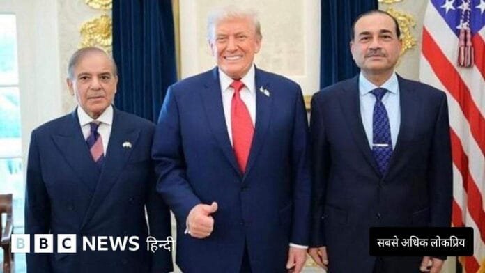 इमेज स्रोत, GOVERNMENT OF PAKISTANइमेज कैप्शन, पाकिस्तानी प्रधानमंत्री शहबाज़ शरीफ़ और सेना प्रमुख आसिम मुनीर राष्ट्रपति डोनाल्ड ट्रंप से मिलने न्यूयॉर्क से वॉशिंगटन पहुंचे थे….मेंपाकिस्तान के प्रधानमंत्री शहबाज़ शरीफ़ और सेना प्रमुख फ़ील्ड मार्शल आसिम मुनीर ने अमेरिका के राष्ट्रपति डोनाल्ड ट्रंप से वॉशिंगटन में मुलाक़ात की. इससे ठीक पहले अमेरिकी राष्ट्रपति ने दोनों को ‘महान व्यक्तित्व’ बताया.दूसरी तरफ़, पाकिस्तान सरकार की ओर से जारी विज्ञप्ति के अनुसार प्रधानमंत्री शहबाज़ शरीफ़ ने राष्ट्रपति ट्रंप से कहा कि वह दुनिया के ‘शांति दूत’ हैं. पाकिस्तान के रक्षा मंत्री ख़्वाजा आसिफ़ ने इस मुलाक़ात के बाद सोशल मीडिया पर लिखा, “हाइब्रिड मॉडल की पार्टनरशिप की कामयाबियों का सिलसिला.”पिछले सप्ताह राष्ट्रपति ट्रंप से मुलाक़ात के लिए प्रधानमंत्री शहबाज़ शरीफ़ न्यूयॉर्क से वॉशिंगटन पहुंचे. वो संयुक्त राष्ट्र महासभा की मीटिंग में हिस्सा लेने न्यूयॉर्क गए थे.ओवल ऑफ़िस में होने वाली इस मुलाक़ात में अमेरिका के उपराष्ट्रपति जेडी वेंस और विदेश मंत्री मार्को रूबियो भी शामिल थे.प्रधानमंत्री शहबाज़ शरीफ़ की एक हफ़्ते के दौरान अमेरिकी राष्ट्रपति से यह दूसरी मुलाक़ात थी.इससे पहले ग़ज़ा के मामले पर कुछ इस्लामी देशों के नेताओं के साथ बैठक के मौक़े पर भी उनकी राष्ट्रपति ट्रंप से मुलाक़ात हुई थी.अमेरिका के राष्ट्रपति डोनाल्ड ट्रंप ने प्रधानमंत्री शहबाज़ शरीफ़ से मुलाक़ात से पहले प्रेस कॉन्फ़्रेंस के दौरान कहा कि वह दो “महान नेताओं से मुलाक़ात कर रहे हैं. पाकिस्तान के प्रधानमंत्री और फ़ील्ड मार्शल, और दोनों ही बेहतरीन व्यक्तित्व हैं.”राष्ट्रपति डोनाल्ड ट्रंप ने कहा, “मुझे पहुंचने में कुछ देर हो रही है. वह ख़ूबसूरत ओवल ऑफ़िस पहुंच चुके हैं. अभी कुछ देर में उनसे मुलाक़ात होगी.”ट्रंप के साथ मुलाक़ात में क्या हुआ?इमेज स्रोत, GOVERNMENT OF PAKISTANइमेज कैप्शन, प्रधानमंत्री शहबाज़ शरीफ़ की एक सप्ताह में अमेरिकी राष्ट्रपति के साथ यह दूसरी बैठक थीइस साल जून में अमेरिकी राष्ट्रपति ट्रंप ने पाकिस्तान सेना के प्रमुख फ़ील्ड मार्शल आसिम मुनीर को लंच पर दावत दी थी लेकिन उस मुलाक़ात में प्रधानमंत्री शहबाज़ शरीफ़ उनके साथ नहीं थे.हाल की मुलाक़ात के बाद पाकिस्तान के प्राइम मिनिस्टर हाउस से जारी होने वाले बयान के अनुसार मुलाक़ात सौहार्दपूर्ण थी. बयान में पाकिस्तान-भारत के बीच युद्ध रोकने और शांति स्थापना के लिए राष्ट्रपति ट्रंप की कोशिशों के सम्मान में उन्हें ‘मैन ऑफ़ पीस’ बताया गया.सरकारी बयान में कहा गया है कि प्रधानमंत्री शहबाज़ शरीफ़ ने राष्ट्रपति ट्रंप से कहा कि वह मध्य पूर्व तनाव और विशेषकर फ़लस्ती