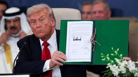 इमेज स्रोत, Suzanne Plunkett – Pool / Gettyइमेज कैप्शन, ट्रंप ने कहा कि एक नए और खूबसूरत दिन की शुरुआत हो रही हैअमेरिकी राष्ट्रपति डोनाल्ड ट्रंप और मिस्र, क़तर और तुर्की के नेताओं ने ग़ज़ा में शांति की बहाली के लिए एक घोषणा-पत्र पर हस्ताक्षर किए हैं.ये हस्ताक्षर सोमवार को मिस्र के शर्म अल-शेख़ में आयोजित एक सम्मेलन में हुए, जिसमें 20 से अधिक देशों के नेता शामिल हुए.इस मौक़े पर ट्रंप ने कहा, “एक नए और खूबसूरत दिन की शुरुआत हो रही है, अब पुनर्निर्माण शुरू हो रहा है.”उन्होंने इसराइल और हमास के बीच युद्धविराम कराने में मदद करने वाले मध्य-पूर्व देशों के नेताओं की सराहना की.वहीं, मिस्र के राष्ट्रपति अब्दुल फ़तेह अल-सीसी ने इस दिन को “ऐतिहासिक” बताया.भारत की ओर से विदेश राज्य मंत्री कीर्ति वर्धन सिंह इस सम्मेलन में शामिल हुए.ट्रंप की ग़ज़ा शांति योजना के पहले चरण के तहत सोमवार को इसराइली बंधकों और फ़लस्तीनी क़ैदियों की अदला-बदली हुई. इस चरण में हमास की ओर से 28 इसराइली बंधकों के शवों को वापस करना भी शामिल है.संबंधित कहानियां: