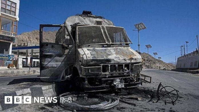 इमेज स्रोत, Getty Imagesइमेज कैप्शन, लद्दाख में प्रदर्शन के दौरान कई वाहनों को आग के हवाले कर दिया गया….मेंह‍िमालयी क्षेत्र लद्दाख की ऊँची पहाड़ियों की कई चोटियों पर अभी बर्फ़ जमी द‍िख रही है. हम लेह में जिस जगह रुके थे, वहाँ की खिड़कियों से ये बर्फ़ीली चोट‍ियाँ साफ़ नज़र आ रही थीं.लेह में प‍िछले कई दिनों से आम ज़‍िंदगी भी जम सी गई थी.जिन सड़कों पर आम लोगों और पर्यटकों की चहल-पहल रहती थी, वहाँ 30 स‍ितंबर तक सन्‍नाटा पसरा था. बाज़ार बंद थे. हालाँक‍ि, अब बाज़ार खुल रहे हैं. ज़‍िंदगी धीरे-धीरे पटरी पर आने की कोशि‍श में है. मोबाइल इंटरनेट सेवाएँ अब भी बंद हैं.लेह में चौबीस सितंबर को लोगों के हुजूम ने सड़कों पर प्रदर्शन किया. प्रदर्शन करने वालों में युवाओं की बड़ी तादाद थी. यह प्रदर्शन देखते-देखते हिंसक हो गया था.सरकारी इमारतों को नुक़सान पहुँचाया गया. भारतीय जनता पार्टी के दफ़्तर में आग लगाने की कोशिश की गई. यहाँ तोड़फोड़ की गई.लद्दाख के लोग आंदोलन क्‍यों कर रहे थेइमेज कैप्शन, लेह में भारतीय जनता पार्टी के कार्यालय के सामने खड़ी पुलिस की गाड़ी में प्रदर्शनकारियों ने आग लगा दी थीसाल 2019 में भारत सरकार ने जम्मू -कश्मीर राज्‍य का विशेष दर्जा ख़त्म कर द‍िया था. साथ ही इसे जम्मू-कश्मीर और लद्दाख में बाँट कर अलग -अलग केंद्र शास‍ित प्रदेश बना दिया था. लद्दाख को केंद्र शासित प्रदेश का दर्जा मिलने से वहाँ के लोग उस वक़्त बेहद ख़ुश थे.हालाँक‍ि, कुछ द‍िनों बाद ही लद्दाख को राज्‍य का दर्जा देने और छठी अनुसूची में शाम‍िल करने की माँग उठने लगी. इस सिलसिले में यहाँ के लोग कई बार अनशन पर बैठे. शांतिपूर्ण प्रदर्शन किया. इस बार भी लेह में मशहूर पर्यावरणव‍िद् सोनम वांगचुक और एपेक्स बॉडी लेह का अनशन चल रहा था. यह अनशन 35 द‍िनों तक चलना था.एपेक्स बॉडी लेह की युवा शाखाओं ने 24 स‍ितंबर को लेह बंद करने का एलान क‍िया था. बंद के दिन अनशन स्थल पर बड़ी तादाद में लोग जमा हो गए. बीते पाँच सालों में ऐसा पहली बार हुआ, जब प्रदर्शनकारी हिंसक हो गए.इसके तुरंत बाद सोनम वांगचुक ने अनशन ख़त्‍म कर द‍िया. दो द‍िन बाद ही उन्‍हें नेशनल सिक्योरिटी एक्ट (एनएसए) के तहत ग‍िरफ़्तार कर जोधपुर जेल भेज द‍िया गया.अनशन और ह‍िंसा की जगह का हालइमेज कैप्शन, 29 सितंबर को लेह के बाज़ार में सन्नाटा पसरा रहाअनशन लेह के एक पार्क में हो रहा था. हम 26 सितंबर0 को इस इलाक़े में थे. वहाँ कुर्सियाँ बिखरी पड़ी थीं. मोटरसाइक‍िलें और स्कूटी उलटी पड़ी द‍िखीं. बिस्तर और दूसरी चीज़ें तहस-नहस थीं. अनशन की जगह से कुछ ही दूरी पर वे इलाक़े हैं, जहाँ हिंसा हुई थी.लेह-मनाली हाईवे पर दाईं और बाईं तरफ़ लेह हिल काउंसिल और बीजेपी का लेह दफ़्तर है. दोनों ही इमारतों को प्रदर्शनकारियों ने नुक़सान 