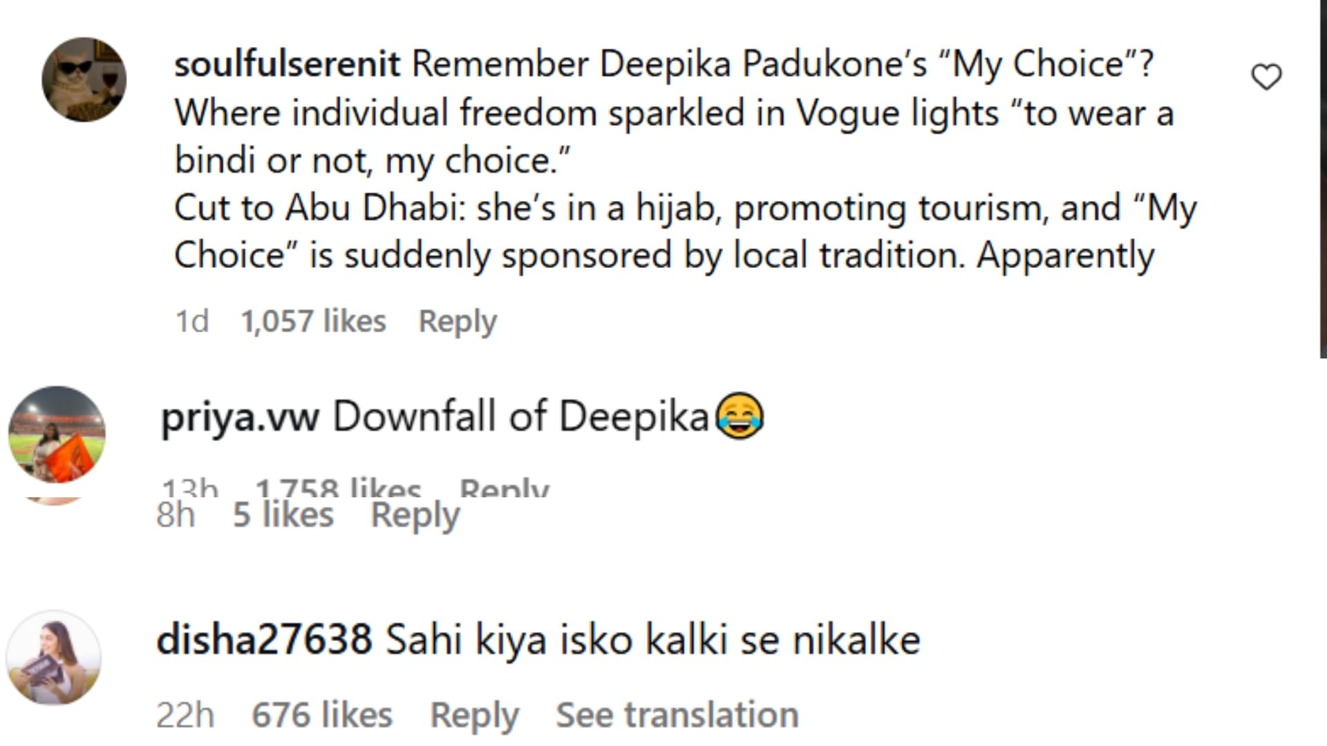 सोशल मीडिया पर कई यूजर्स ने दीपिका की सोच को लेकर सवाल किए। एक यूजर ने लिखा, ‘यह दीपिका का डाउनफॉल है।’ एक अन्य यूजर ने कमेंट किया, ‘दीपिका पादुकोण का ‘माई चॉइस’ याद है? जहां वोग मैगजीन में वह कहती हैं, ‘बिंदी लगाना है या नहीं, मेरी मर्जी। लेकिन अबू धाबी में वह हिजाब पहने पर्यटन को बढ़ावा दे रही हैं। जाहिर है, माई चॉइस अचानक स्थानीय परंपरा द्वारा प्रायोजित हो जाता है।’ एक अन्य यूजर ने लिखा, ‘इसको ‘कल्कि’ फिल्म ने निकालकर सही किया।’ इसी तरह के ट्रोलिंग कमेंट यूजर दीपिका के लिए कमेंट सेक्शन में करते दिखाई दिए।