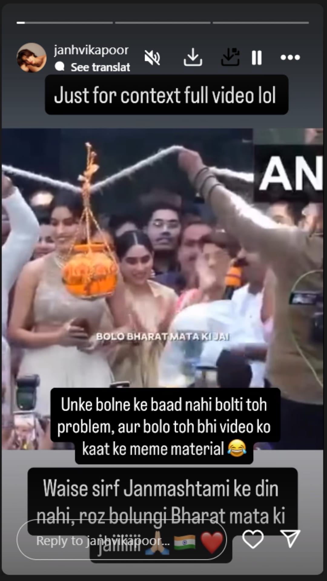 जान्हवी कपूर ने अपने इंस्टाग्राम पर जन्माष्टमी का पूरा वीडियो शेयर किया और लिखा, ‘आपके लिए पूरा वीडियो। इवेंट में लोगों ने भी भारत माता की जय का नारा लगाया था, अगर उनके बोलने के बाद नहीं बोलती तो प्रॉब्लम और बोलो तो भी वीडियो को मीम मटिरियल के तौर पर यूज करते हो। वैसे सिर्फ जन्माष्टमी के दिन नहीं, मैं रोज बोलूंगी भारत माता की जय।’