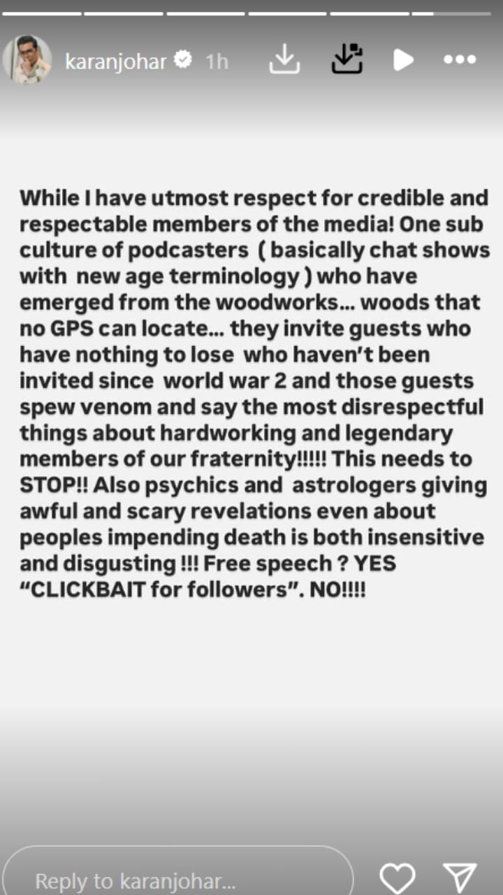 करण जौहर ने पोस्ट में आगे लिखा, ‘यह सब बंद होना चाहिए। फिल्म इंडस्ट्री के लोगों की मौत के बारे में भी भयानक और डरावने खुलासे करने वाले मनोविज्ञानी और ज्योतिषी बहुत असंवेदनशील हैं। यह फ्रीडम ऑफ स्पीज है? क्या यह फॉलोअर्स के लिए क्लिकबेट नहीं है?’ करण जौहर ने अपनी पोस्ट में किसी पॉडकास्टर का नाम नहीं लिया है।