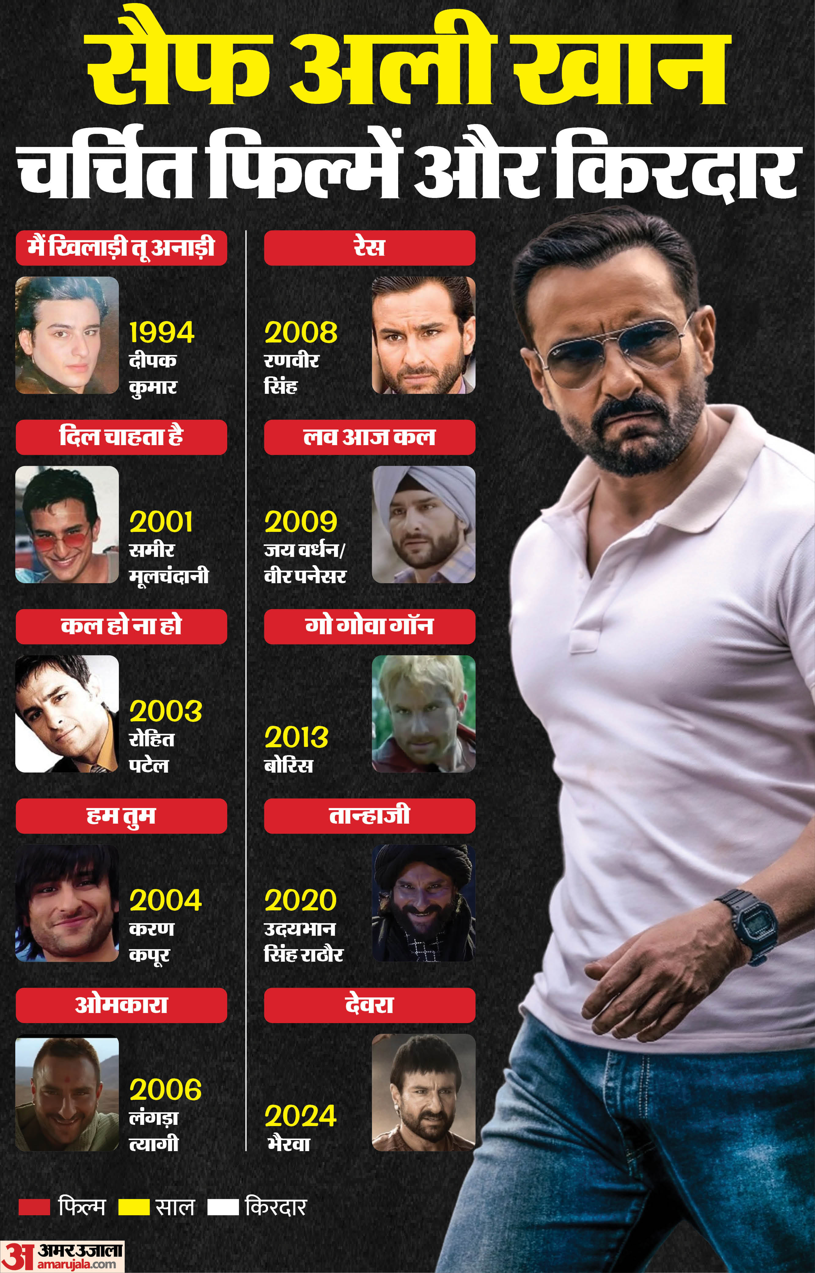 नेगेटिव रोल में छा गए सैफ अली खान: साल 2004 में सैफ अली खान ने ‘एक हसीना थी’ जैसी फिल्म की, इसमें एक ग्रे शेड रोल किया। फिर आया साल 2006, इस साल सैफ अली खान विशाल भारद्वाज निर्देशित फिल्म ‘ओमकारा’ में लगड़ा त्यागी के नेगेटिव रोल में दिखे। इस किरदार में सैफ अली खान को देखकर दर्शक, क्रिटिक्स सभी हैरान रह गए। फिर ‘रेस’ में भी उन्होंने ग्रे शेड रोल किया। फिल्म ‘ताण्हा जी’, ‘देवरा’ और ‘आदिपुरुष’ जैसी फिल्मों में भी वह विलेन के रोल में नजर आए। नेगेटिव किरदारों में ही सैफ अली खान ने दर्शकों को सबसे ज्यादा इंप्रेस किया है।