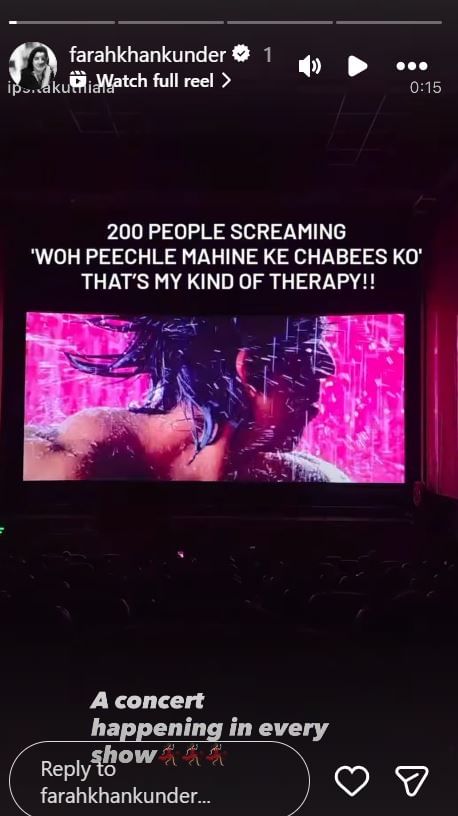 फराह खान ने अपनी इंस्टाग्राम स्टोरी पर एक वीडियो शेयर किया है। इसमें दर्शक सिनेमाघरों में फिल्म के गाने ‘दर्द ए डिस्को’ पर झूमकर नाच रहे हैं। इसके साथ लिखा है, ‘200 से ज्यादा लोग ‘वो पिछले महीने की छब्बीस’ को वाली लाइन पर जोर से चिल्ला रहे हैं। यह मेरी किस्म की थैरेपी है’।